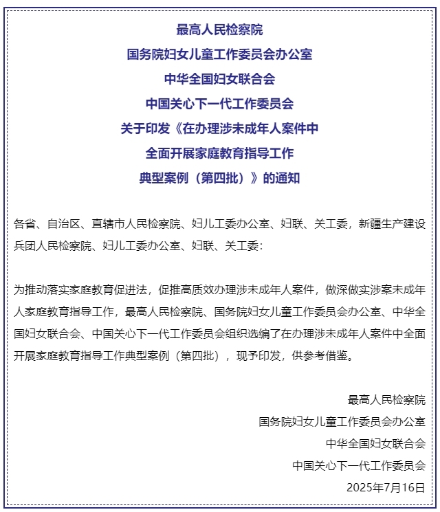 “本批案例明确鼓励各地执法司法机关与妇联、关工委等建立长效协作机制,强化工作衔接。”最高检未成年人检察厅负责人表示,家庭监护问题的扭转非一朝一夕,随着诉讼过程的推进,一个案件会进入不同部门不同环节,检察机关将持续强化与其他司法机关的协作配合,更好保障家庭教育指导工作的稳定性和长效性。
