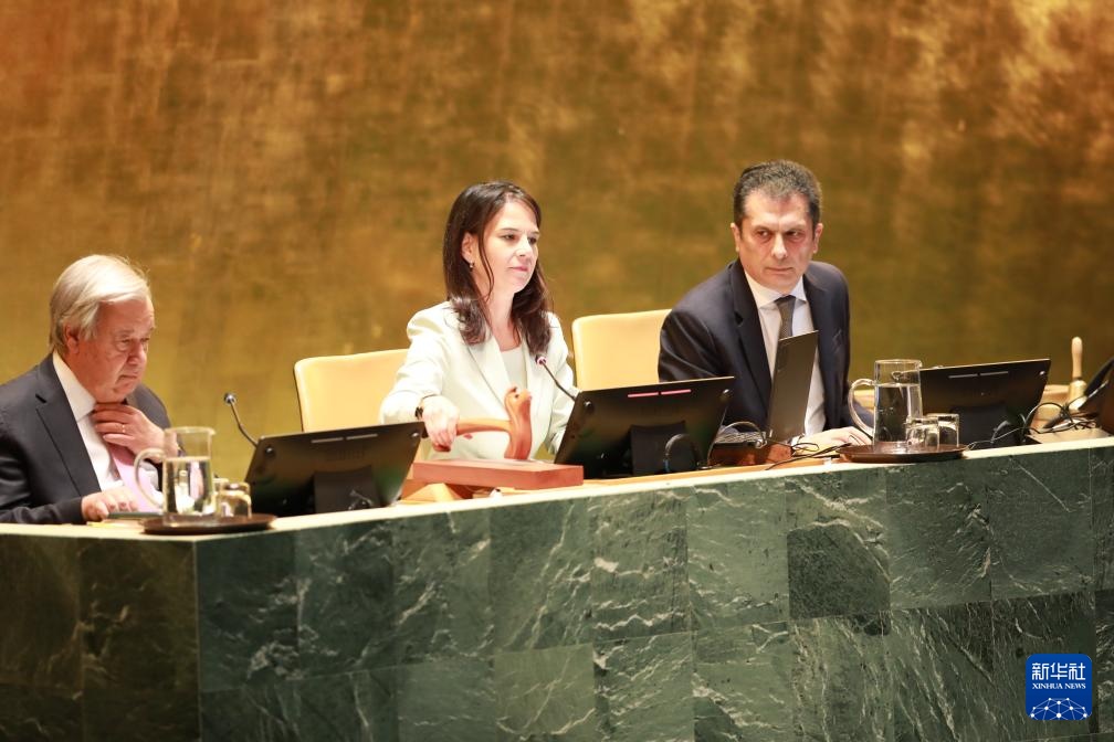 9月9日,第80届联合国大会主席安娜莱娜·贝尔伯克(中)敲槌宣布第80届联大第一次全会开幕。新华社记者 谢锷 摄