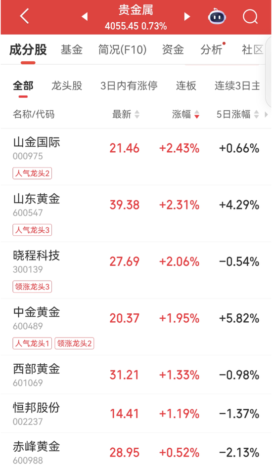 今天,A股贵金属板块与上海贵金属期货携手上涨。山金国际、山东黄金涨幅居前。文华财经数据显示,截至收盘,上期所黄金、白银期货主力合约分别上涨1.99%、1.78%。