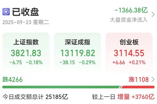 截至收盘,上证指数跌0.18%,深证成指跌0.29%,创业板指涨0.21%。全市场成交额约2.52万亿元,较上一个交易日放量3760亿元。