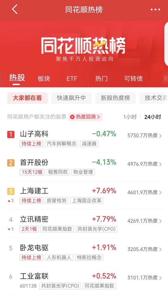 今日,市值400亿元的低价股山子高科跌0.47%,为同花顺24小时热榜第一。今年8月15日以来,山子高科股价累计涨幅超110%。300亿元市值的低价股上海建工涨超7%,位居同花顺24小时热榜第三。